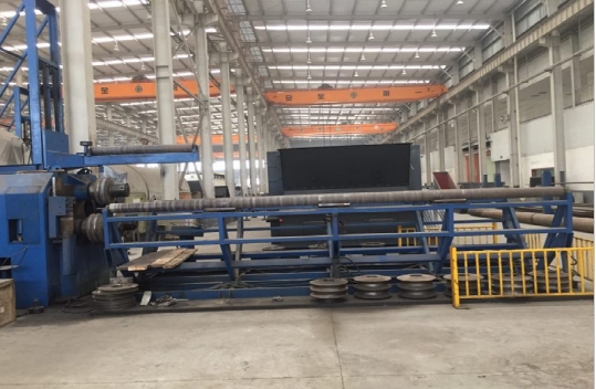 主要由基礎軌道系統、螺旋盤管主機、螺旋管立支撐料架、螺旋管水平出料料架、液壓系統、電控系統、模具等部分組成。